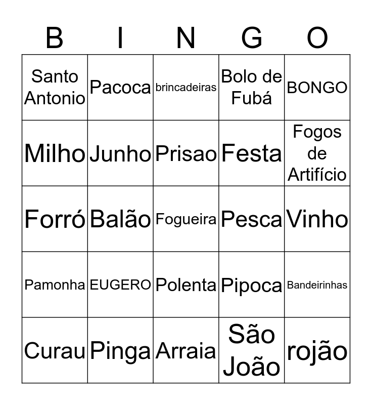 This bingo card has 47 words: Cerveja, Fogueira, Pe de Moleque, Arraia, EUGERO, Chapeu de Palha, Pacoca, Maca do Amor, Milho, DETALHES E CAIXAS, Junho, Bolo de Fubá, Bandeirinhas, Pipoca, LEBO GATO, Quadrilha, Prisao, Pesca, Casamento, BONGO, Balão, São João, Santo Antonio, Festa, SPECIAL BEER HOUSE, Fogos de Artifício, Curau, Cuscuz, Polenta, Pamonha, Amendoim, Cachorro Quente, Quentão, Bingo, Pau de Sebo, Pinga, Vinho, Choconhaque, Tati Fofa, Batata Doce, rojão, brincadeiras, Forró, Caipira, Aniversário, 31 Anos and Maçã do Amor.