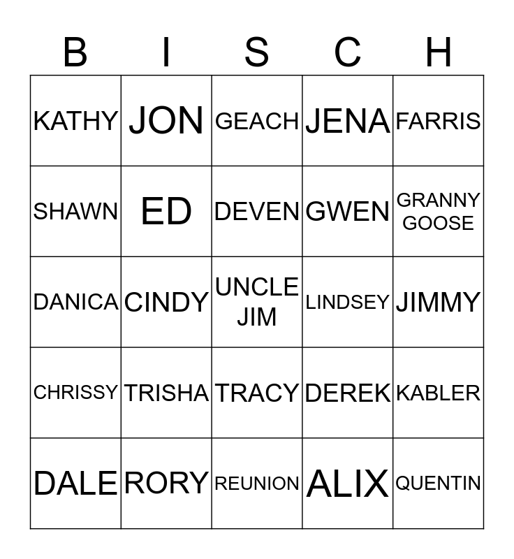 This bingo card has a free space and 24 words: TRISHA, RORY, DEVEN, DALE, FARRIS, KATHY, SHAWN, JON, LINDSEY, TRACY, GWEN, DANICA, DEREK, KABLER, ED, ALIX, JIMMY, GEACH, GRANNY GOOSE, CINDY, QUENTIN, CHRISSY, JENA and REUNION.