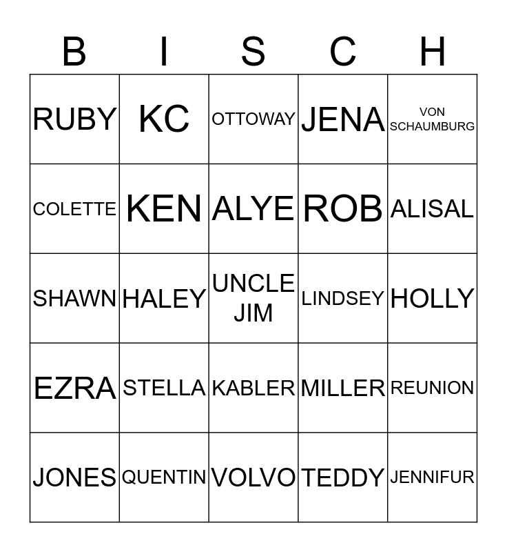 This bingo card has a free space and 24 words: STELLA, QUENTIN, ALYE, JONES, VON SCHAUMBURG, RUBY, COLETTE, KC, LINDSEY, KABLER, ROB, SHAWN, MILLER, REUNION, KEN, TEDDY, HOLLY, OTTOWAY, ALISAL, HALEY, JENNIFUR, EZRA, JENA and VOLVO.