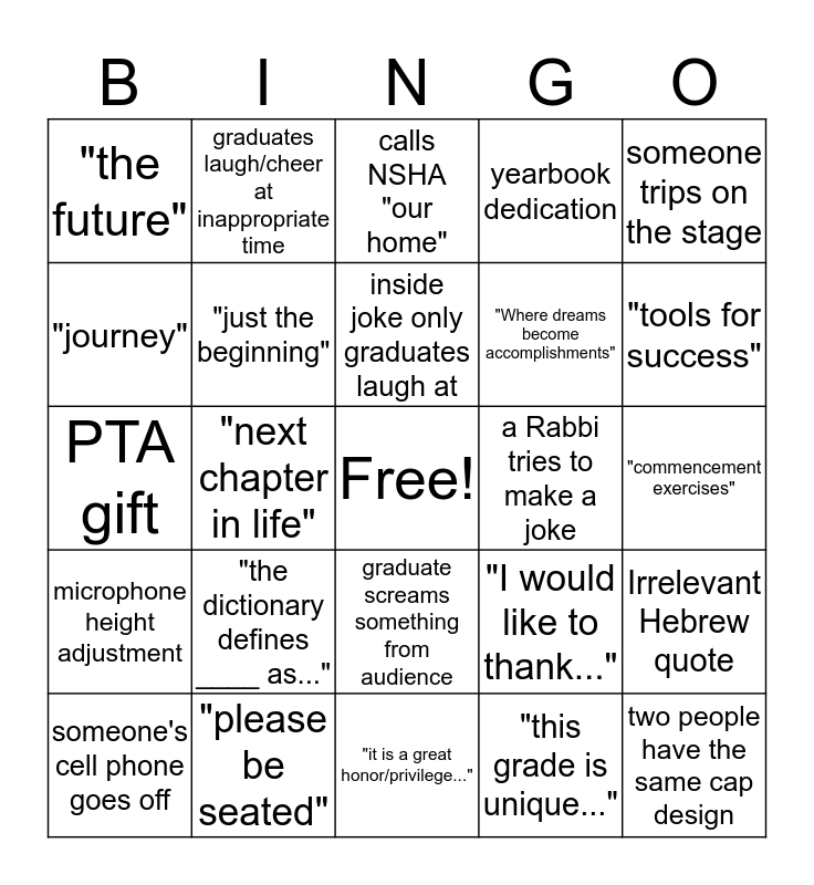 This bingo card has a free space and 28 words: Irrelevant Hebrew quote, Awkwardly placed Dvar Torah, "Where dreams become accomplishments", "this grade is unique...", "journey", calls NSHA "our home", graduates laugh/cheer at inappropriate time, microphone height adjustment, a Rabbi tries to make a joke, someone's cell phone goes off, PTA gift, yearbook dedication, "please be seated", "it is a great honor/privilege...", "tools for success", baby cries, "the dictionary defines ____ as...", "just the beginning", inside joke only graduates laugh at, graduate screams something from audience, "the future", someone starts crying, two people have the same cap design, "next chapter in life", "commencement exercises", "I would like to thank...", someone trips on the stage and underwhelming class gift.