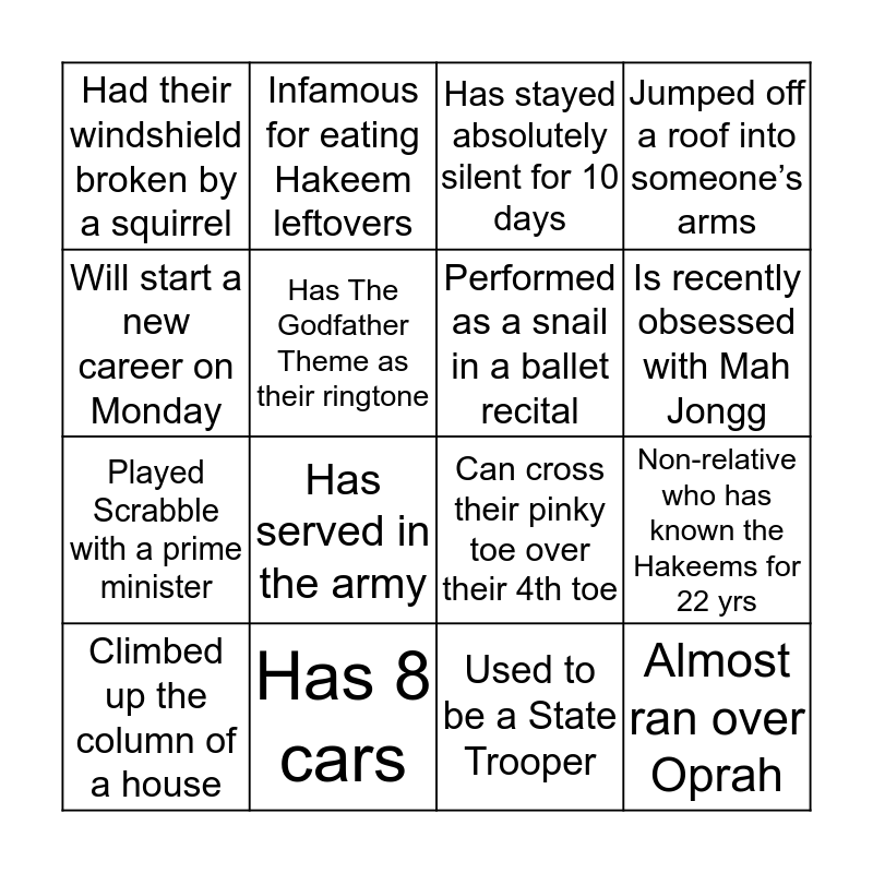 This bingo card has 16 words: Has 8 cars, Non-relative who has known the Hakeems for 22 yrs, Has stayed absolutely silent for 10 days, Had their windshield broken by a squirrel, Played Scrabble with a prime minister, Infamous for eating Hakeem leftovers, Can cross their pinky toe over their 4th toe, Used to be a State Trooper, Will start a new career on Monday, Has The Godfather Theme as their ringtone, Climbed up the column of a house, Jumped off a roof into someone’s arms, Has served in the army, Is recently obsessed with Mah Jongg, Performed as a snail in a ballet recital and Almost ran over Oprah.