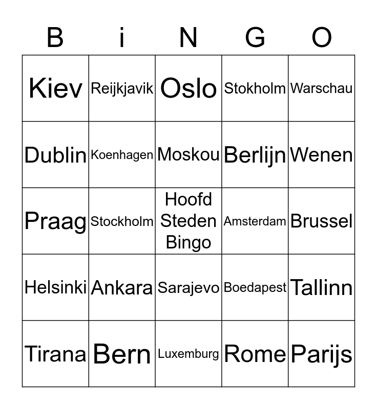 This bingo card has a free space and 29 words: Tirana, Sofia, Stockholm, Monaco, Kiev, Oslo, Koenhagen, Ankara, Amsterdam, Bern, Brussel, Parijs, Luxemburg, Rome, Wenen, Eddinburgh, Sarajevo, Helsinki, Warschau, Praag, Boedapest, Athene, Berlijn, Dublin, Stokholm, Reijkjavik, Tallinn, Moskou and Bratislava.