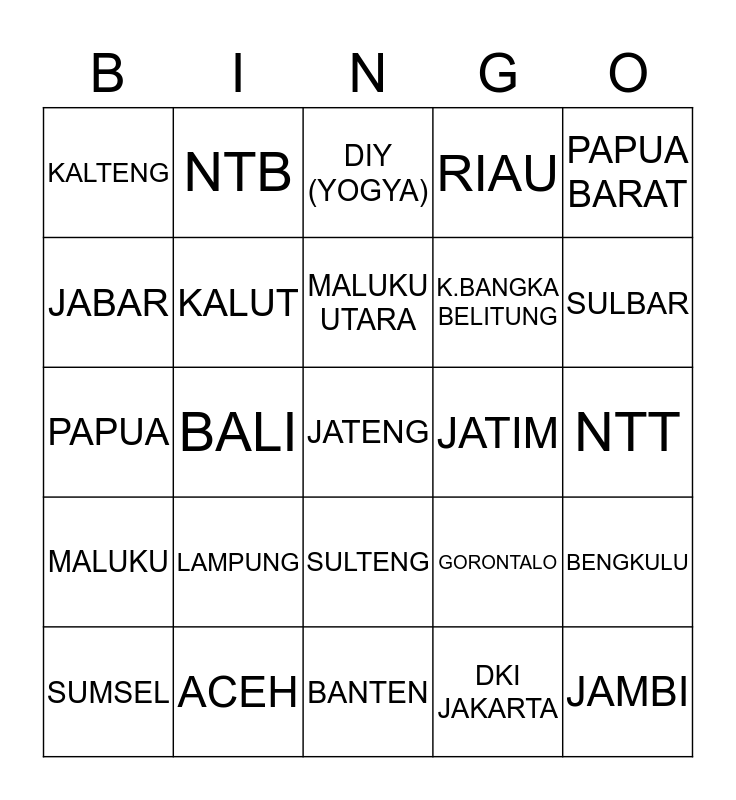 This bingo card has a free space and 24 words: LAMPUNG, ACEH, MALUKU UTARA, SUMSEL, PAPUA BARAT, KALTENG, JABAR, NTB, JATIM, SULTENG, K.BANGKA BELITUNG, PAPUA, GORONTALO, BENGKULU, KALUT, DKI JAKARTA, NTT, DIY (YOGYA), SULBAR, BALI, JAMBI, MALUKU, RIAU and BANTEN.