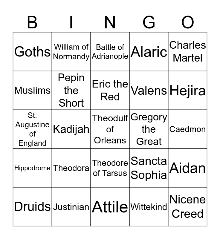 This bingo card has 65 words: Kaaba, St. Ambrose, Paulinus, Aidan, Koran, Alfred the Great, William of Normandy, Rurik, Eric the Red, Louis VI, Theodore of Tarsus, Venerable Bede, Caedmon, Charles Martel, Mohammed, Muslims, Kadijah, Goths, Huns, Valens, Theodora, Hippodrome, Alaric, St. Jerome, Islam, Constantinople, St. Boniface, Fortunatus, Theodulf of Orleans, St. Patrick, Druids, Stonehenge, Salic Law, Laws of the Barbarians, Sancta Sophia, Justinian, St. Martin of Tours, St. Augustine of England, Wittekind, Saxons, Pepin the Short, Odin, Gregory the Great, Theodoric, Athelstan, Sweyn, Hejira, Constantine, Nicene Creed, Palace School at Aix, Charlemagne, Theodosius, St. Augustine, Attile, Mayors of the Palace, Franks, Clovis, Battle of Adrianople, Canute, Rollo, Valhalla, Lindisfarne, The Hundred, Norsemen and capitularies.