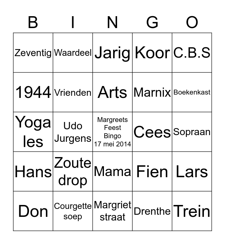 This bingo card has a free space and 30 words: Courgette soep, Oma, Udo Jurgens, Renkum, Zeventig, Jarig, Vrienden, Mama, Cees, Margriet straat, Sopraan, Trein, Drenthe, Speklappen, Boekenkast, kunst, Fien, Hans, Zoute drop, C.B.S, Yoga les, B.S.P, Waardeel, Marnix, 1944, Koor, Lars, Don, Arts and Brabant.