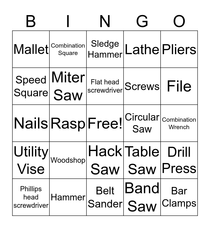 This bingo card has a free space and 24 words: Woodshop, Hammer, Flat head screwdriver, Phillips head screwdriver, Pliers, Mallet, Speed Square, Combination Square, Circular Saw, Hack Saw, Screws, Nails, Table Saw, Drill Press, Miter Saw, Band Saw, Combination Wrench, Sledge Hammer, File, Rasp, Bar Clamps, Utility Vise, Lathe and Belt Sander.