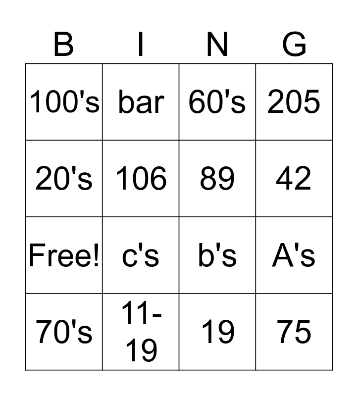 This bingo card has 20 words: A's, 80's, 60's, 50's, 70's, 20's, 11-19, 100's, Free!, bar, c's, b's, 106, 75, 89, 35, 42, 205, 19 and C's.