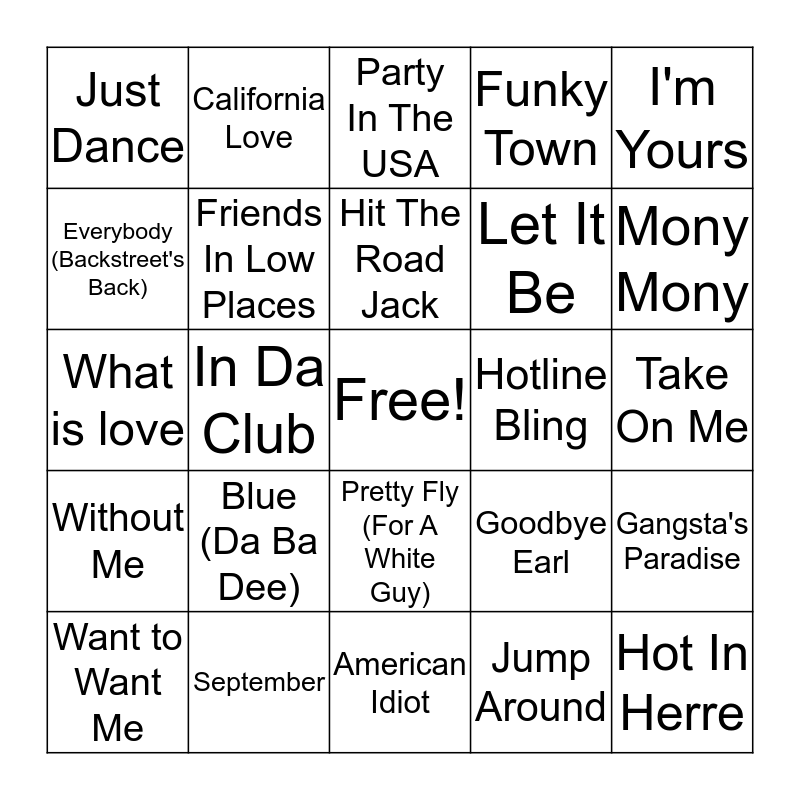 This bingo card has a free space and 50 words: Hey Ya!, Hot In Herre, 1234, American Idiot, Blue (Da Ba Dee), Buffalo Soldier, California Love, Dynamite, Everybody (Backstreet's Back), Finally, Friends In Low Places, Funky Town, Gangsta's Paradise, Goodbye Earl, Groove Is In The Heart, Havana, Hit The Road Jack, Hotline Bling, Hound Dog, I'm Yours, In Da Club, Jump Around, Just Dance, Let It Be, Light My Fire, Livin' La Vida Loca, Mony Mony, New Orleans Is Sinking, Party In The USA, Pretty Fly (For A White Guy), Push It, Radioactive, Rock Around The Clock, Rocket Man, September, Show Me Love, Shut Up and Dance, Stop!, Stronger, Take On Me, The Unicorn Song, Thrift Shop, Thunder Struck, Timber, Want to Want Me, What is love, What Lovers Do, Who Let The Dogs Out, Without Me and You Can Call Me Al.