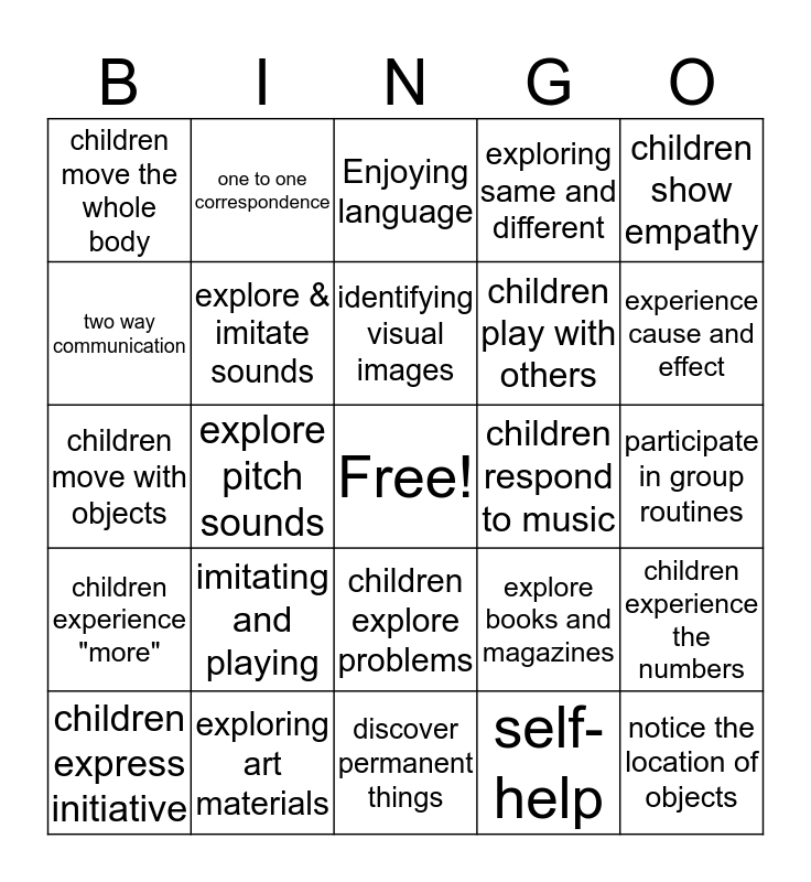 This bingo card has a free space and 24 words: imitating and playing, exploring art materials, identifying visual images, children express initiative, children show empathy, children move the whole body, two way communication, one to one correspondence, children respond to music, children explore problems, children play with others, children move with objects, explore books and magazines, children experience the numbers, explore & imitate sounds, self-help, participate in group routines, Enjoying language, experience cause and effect, explore pitch sounds, notice the location of objects, children experience "more", exploring same and different and discover permanent things.