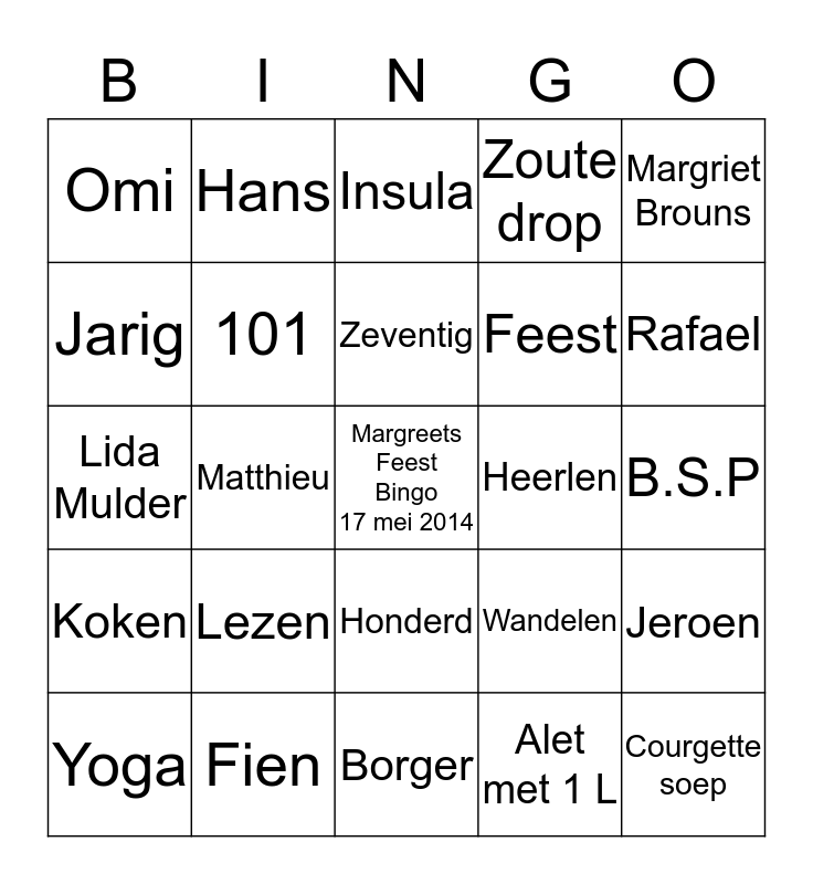 This bingo card has a free space and 30 words: Fien, Don, Matthieu, Fritte keteltje, Omi, Insula, 101, Honderd, Heerlen, Borger, B.S.P, Courgette soep, Alet met 1 L, Maria, Rafael, Sopraan, Wandelen, Koken, Lezen, Margriet Brouns, Lida Mulder, Lars, Hans, Feest, Jarig, Zoute drop, Jeroen, Yoga, Zeventig and Mama.