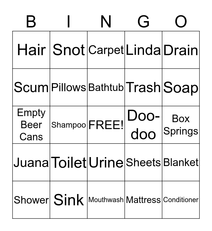 This bingo card has a free space and 24 words: Toilet, Sink, Bathtub, Shower, Drain, Hair, Scum, Snot, Doo-doo, Urine, Trash, Empty Beer Cans, Sheets, Blanket, Pillows, Mattress, Box Springs, Carpet, Soap, Shampoo, Conditioner, Juana, Linda and Mouthwash.