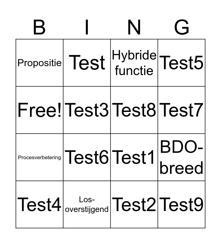 This bingo card has 16 words: Los-overstijgend, BDO-breed, Hybride functie, Propositie, Procesverbetering, Test, Test1, Test2, Free!, Test3, Test4, Test5, Test6, Test7, Test8 and Test9.