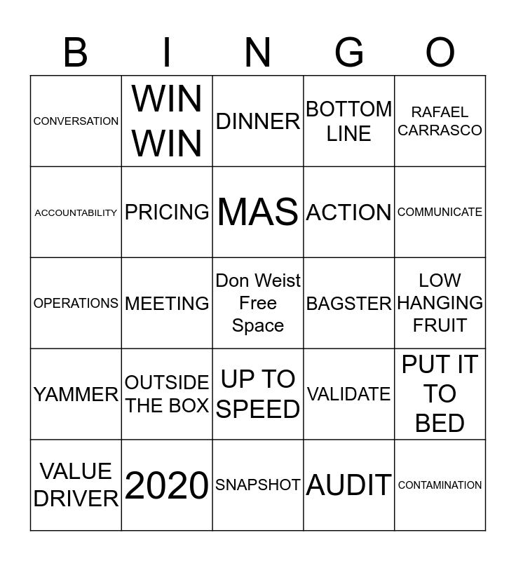 This bingo card has a free space and 47 words: SALESFORCE, CONTAMINATION, CONTRACT, SNAPSHOT, OUTSIDE THE BOX, BEST PRACTICE, WIN WIN, LESSONS LEARNED, ACCOUNTABILITY, GAME PLAN, PRICING, BOTTOM LINE, PUT IT TO BED, VALIDATE, BOOK OF BUSINESS (BOB), CORE BUSINESS, MAS, BAGSTER, LEGAL, RAFAEL CARRASCO, MEETING, AUDIT, CONVERSATION, ACTION, AGING, COMMUNICATE, VALUE DRIVER, PUBLIC SECTOR, UP TO SPEED, YAMMER, AGENDA, BRAND, OPPORTUNITIES, OPEN MARKET RESI (OMR), SUSTAINABLE, 2020, LOW HANGING FRUIT, PROACTIVE, ETA, RIGHTSIZE, CREDIT ADJUSTMENT, DINNER, OPERATIONS, DISPATCH, SALES, SKYPE and HOUSEKEEPING.