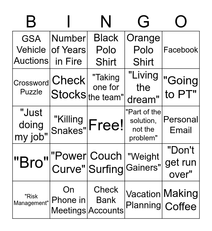 This bingo card has a free space and 29 words: "Risk Management", Sports Page, "Killing Snakes", Cycling Equipment, GSA Vehicle Auctions, Black Polo Shirt, Check Stocks, "Power Curve", "Part of the solution, not the problem", On Phone in Meetings, Personal Email, Making Coffee, Check Bank Accounts, Vacation Planning, "Going to PT", House/ Property Hunting, Couch Surfing, "Bro", Facebook, "Just doing my job", "Weight Gainers", "Want some jerky?", "Living the dream", Crossword Puzzle, Orange Polo Shirt, Number of Years in Fire, "Don't get run over", "Taking one for the team" and "Sunnyside Up".