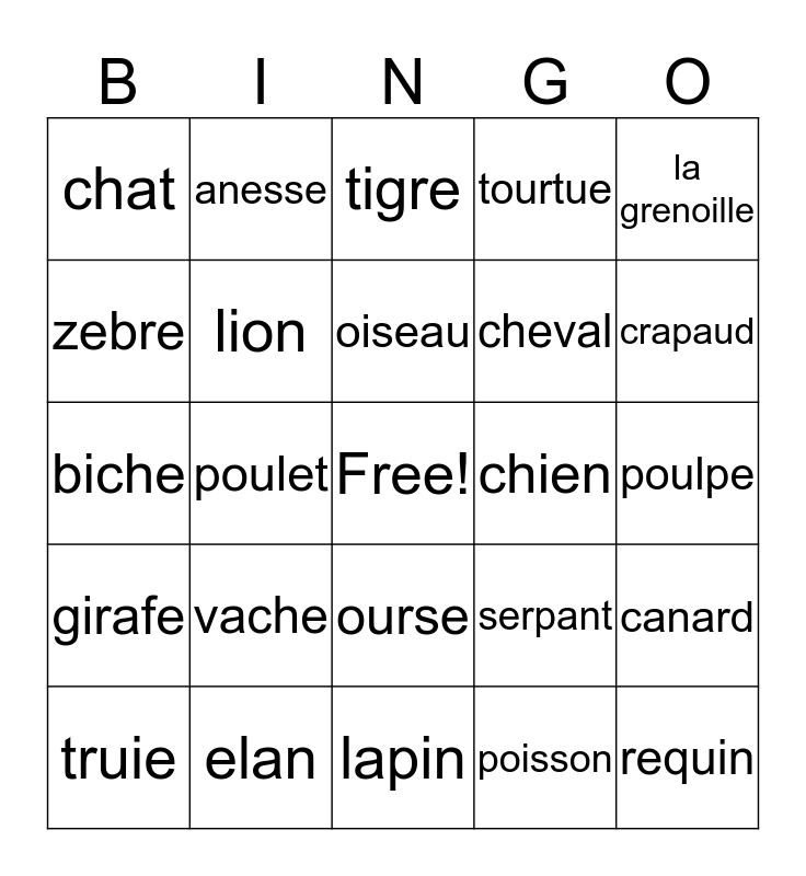 This bingo card has a free space and 24 words: vache, elan, oiseau, truie, la grenoille, chat, zebre, anesse, chien, ourse, cheval, biche, serpant, canard, lion, poisson, poulpe, tigre, crapaud, poulet, requin, girafe, tourtue and lapin.