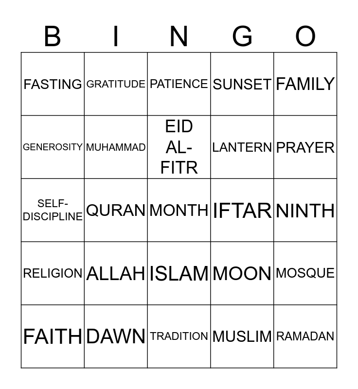 This bingo card has a free space and 24 words: ALLAH, DAWN, EID AL-FITR, FAITH, FAMILY, FASTING, GENEROSITY, GRATITUDE, IFTAR, ISLAM, LANTERN, SELF-DISCIPLINE, MOON, MOSQUE, MUHAMMAD, MUSLIM, NINTH, PATIENCE, PRAYER, QURAN, RAMADAN, RELIGION, SUNSET and TRADITION.