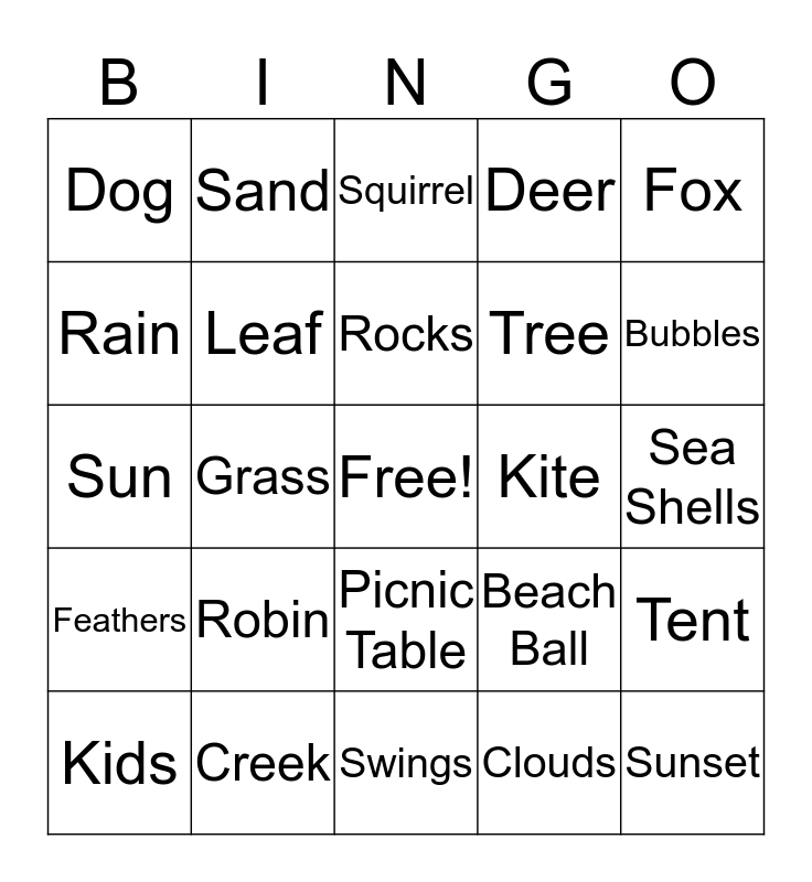 This bingo card has a free space and 24 words: Robin, Creek, Rocks, Kids, Fox, Dog, Rain, Sand, Kite, Picnic Table, Tree, Sun, Beach Ball, Tent, Leaf, Clouds, Sea Shells, Squirrel, Bubbles, Grass, Sunset, Feathers, Deer and Swings.