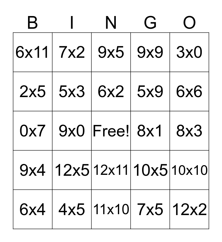 This bingo card has a free space and 34 words: 12x4, 7x5, 2x8, 3x3, 9x4, 5x3, 3x0, 6x4, 7x2, 11x11, 6x2, 9x5, 8x4, 4x3, 8x1, 6x6, 4x5, 0x7, 12x5, 10x5, 12x11, 5x5, 6x11, 8x3, 11x10, 12x2, 9x9, 6x5, 5x9, 2x5, 9x6, 9x0, 10x10 and 12x10.