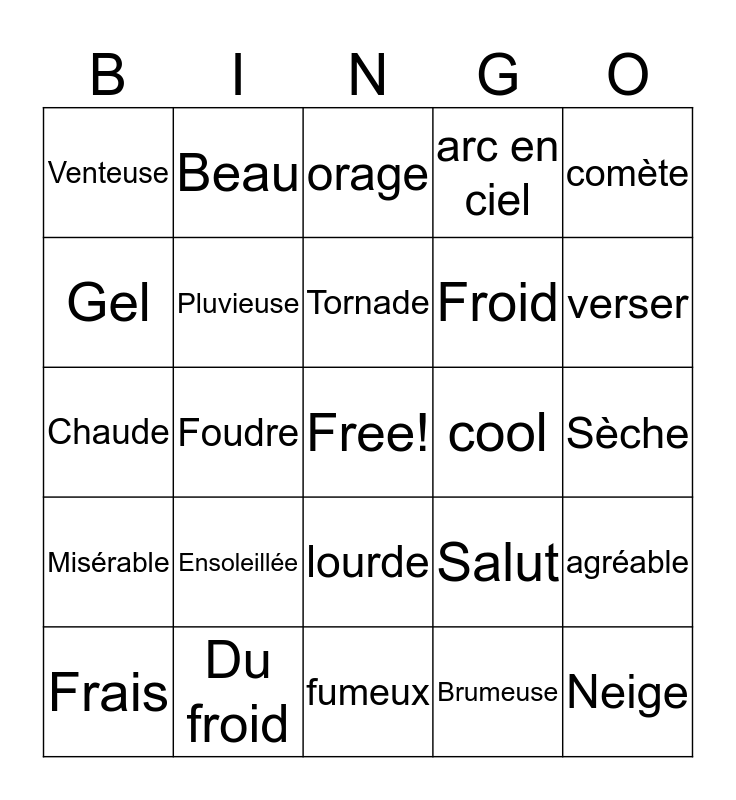 This bingo card has a free space and 24 words: Ensoleillée, Du froid, Tornade, Frais, comète, Venteuse, Gel, Beau, cool, lourde, Froid, Chaude, Salut, agréable, Pluvieuse, Brumeuse, Sèche, orage, verser, Foudre, Neige, Misérable, arc en ciel and fumeux.