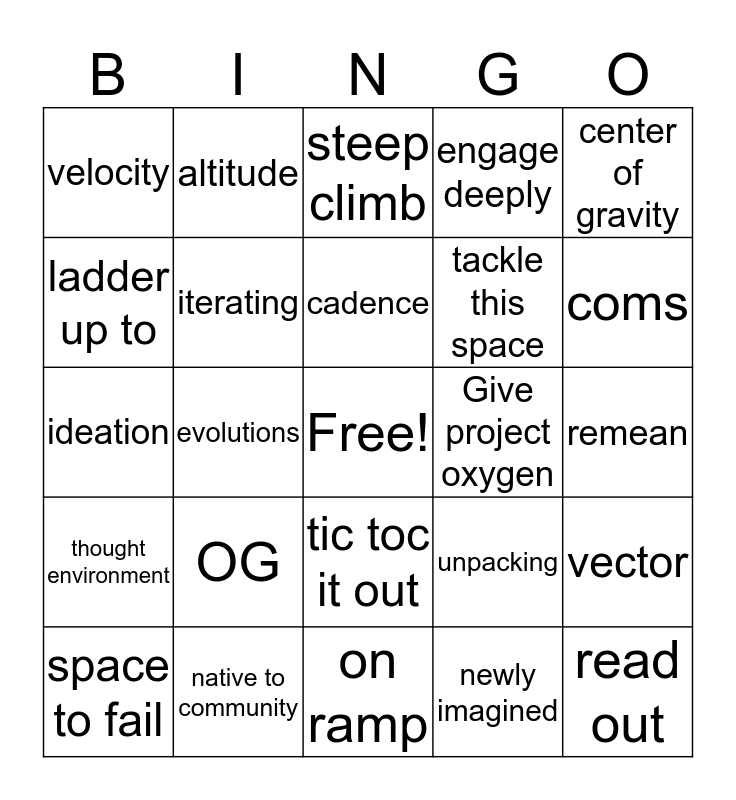 This bingo card has a free space and 24 words: OG, native to community, cadence, space to fail, center of gravity, velocity, ladder up to, altitude, Give project oxygen, tic toc it out, tackle this space, ideation, unpacking, vector, iterating, newly imagined, remean, steep climb, coms, evolutions, read out, thought environment, engage deeply and on ramp.
