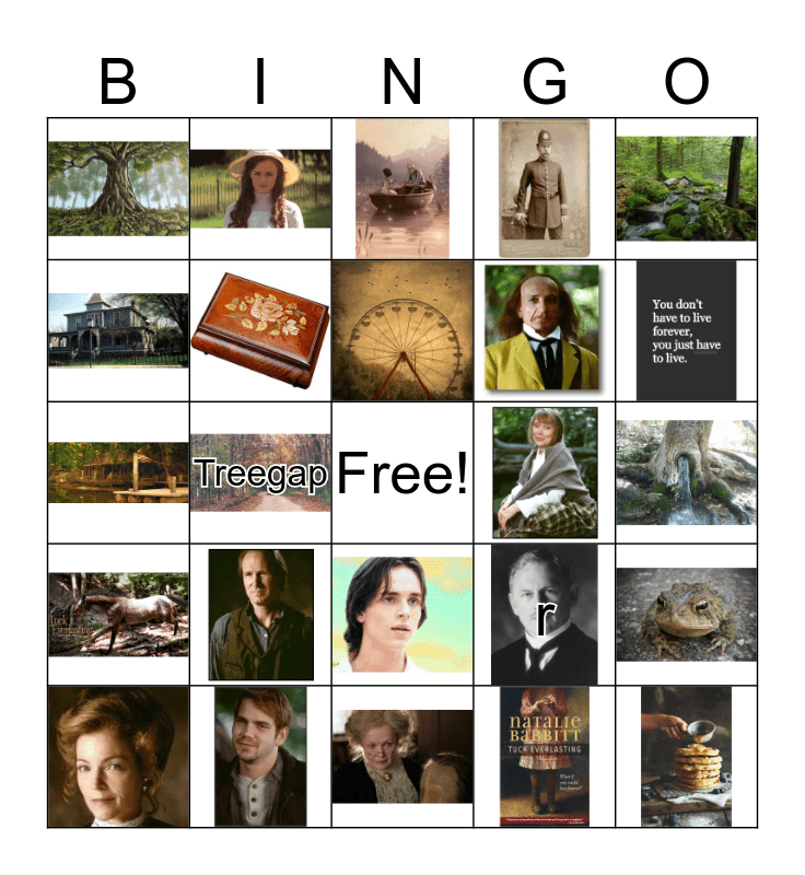 This bingo card has 24 images, a free space and 2 words: r and Treegap.