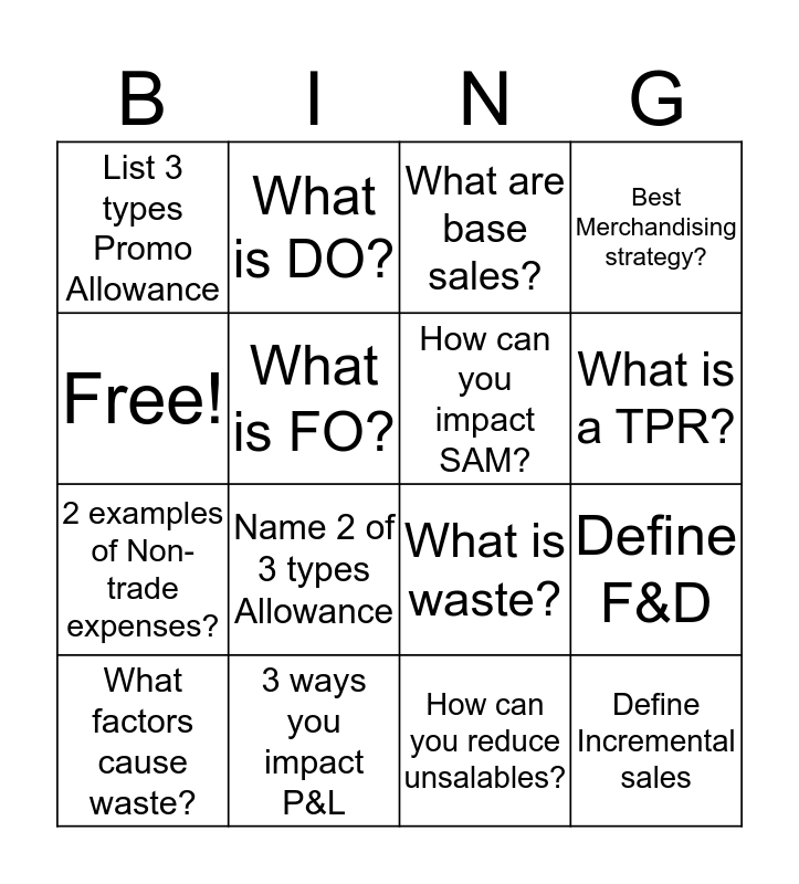 This bingo card has 1 images and 16 words: 3 ways you impact P&L, Define F&D, What are base sales?, List 3 types Promo Allowance, 2 examples of Non-trade expenses?, What is DO?, What is waste?, How can you reduce unsalables?, Free!, What is FO?, What factors cause waste?, Best Merchandising strategy?, Name 2 of 3 types Allowance, What is a TPR?, How can you impact SAM? and Define Incremental sales.