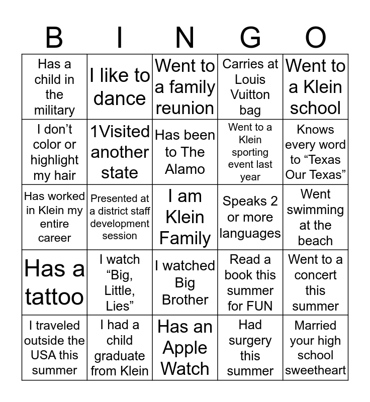 This bingo card has a free space and 24 words: I watch “Big, Little, Lies”, I had a child graduate from Klein, Has been to The Alamo, I traveled outside the USA this summer, Went to a Klein school, Has a child in the military, I don’t color or highlight my hair, I like to dance, Speaks 2 or more languages, I watched Big Brother, Went to a Klein sporting event last year, Has worked in Klein my entire career, Read a book this summer for FUN, Went to a concert this summer, 1Visited another state, Had surgery this summer, Went swimming at the beach, Went to a family reunion, Knows every word to “Texas Our Texas”, Presented at a district staff development session, Married your high school sweetheart, Has a tattoo, Carries at Louis Vuitton bag and Has an Apple Watch.