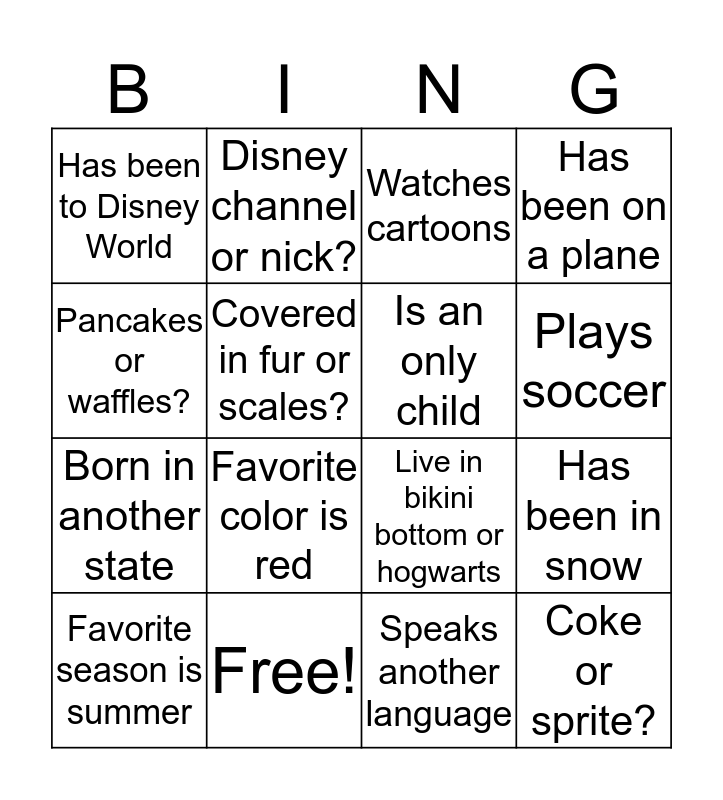 This bingo card has 28 words: Is 9 years old, Likes to go to the beach, Born in another state, Knows how to ride a bike, Covered in fur or scales?, Watches cartoons, Disney channel or nick?, Coke or sprite?, Free!, Goes to Cordova Park, Live in bikini bottom or hogwarts, Has been on a plane, Favorite color is yellow, Knows how to swim, Favorite color is red, Birthday is in June, Water park or amusement park, Is an only child, Plays soccer, Going into 3rd grade, Has been to Disney World, Likes to draw, Favorite season is summer, Has been in snow, Speaks another language, Can whistle, Pancakes or waffles? and Chocolate or vanilla?.