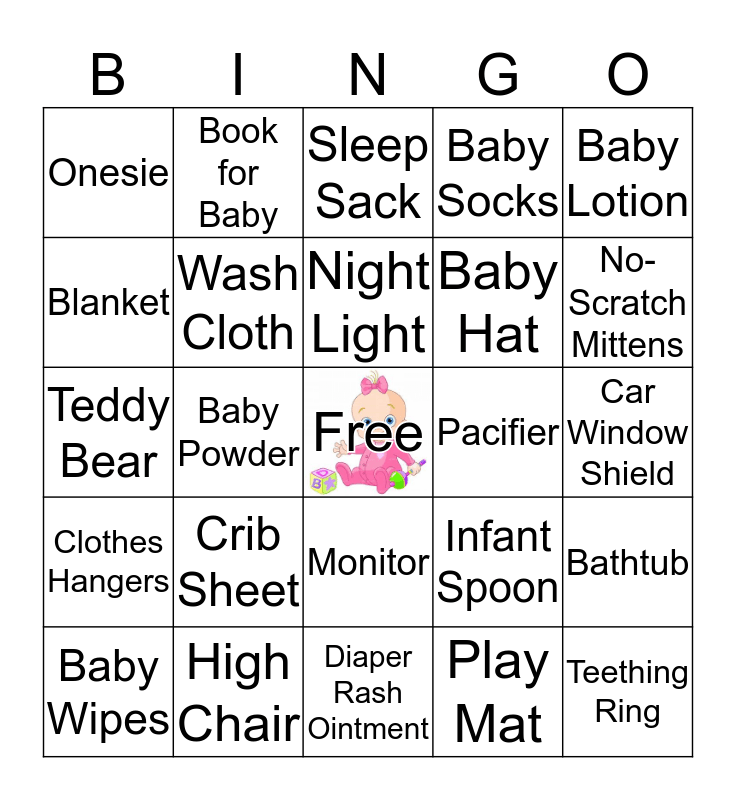 This bingo card has a free space and 49 words: Bottle, Teething Ring, Hooded Towel, Diaper Rash Ointment, Crib Sheet, Nail Clippers, Book for Baby, Diaper Bag, Blanket, Burp Cloth, Wash Cloth, Baby Socks, Bathtub, Infant Spoon, Sippy Cup, Baby Outfit, Night Light, Pacifier, Baby Shampoo, Baby Lotion, Baby Powder, Play Mat, Onesie, Baby Hat, Laundry Detergent, No-Scratch Mittens, Baby Wipes, Brush & Comb Set, Monitor, Clothes Hangers, Bottle Brush, Pack N Play, Baby Mobile, Bassinet, High Chair, Car Seat, Stroller, Stroller Cover, Car Window Shield, Doll Baby, Gift Card, Changing Pad, Picture Frame, Rattle, Teddy Bear, Sleep Sack, Nightgown, Boppy Pillow and Rubber Duck.