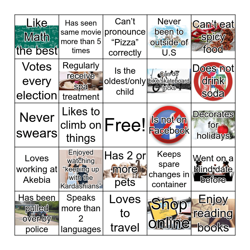 This bingo card has 14 images, a free space and 24 words: Enjoyed watching “keeping up with the Kardashians”, Speaks more than 2 languages, Is the oldest/only child, Has been pulled over by police, Can’t eat spicy food, Like Math the best, Votes every election, Has seen same movie more than 5 times, Is not on Facebook, Has 2 or more pets, Can do bike/skateboard tricks, Never swears, Keeps spare changes in container, Went on a blind date before, Regularly receive spa treatment, Shop online, Decorates for holidays, Can’t pronounce “Pizza” correctly, Does not drink soda, Likes to climb on things, Enjoy reading books, Loves working at Akebia, Never been to outside of U.S and Loves to travel.