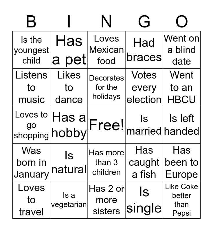 This bingo card has a free space and 24 words: Is natural, Is a vegetarian, Decorates for the holidays, Loves to travel, Went on a blind date, Is the youngest child, Listens to music, Has a pet, Is married, Has more than 3 children, Votes every election, Loves to go shopping, Has caught a fish, Has been to Europe, Likes to dance, Is single, Is left handed, Loves Mexican food, Went to an HBCU, Has a hobby, Like Coke better than Pepsi, Was born in January, Had braces and Has 2 or more sisters.