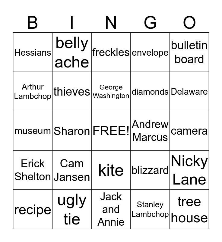 This bingo card has a free space and 24 words: Cam Jansen, ugly tie, George Washington, recipe, bulletin board, Hessians, Arthur Lambchop, belly ache, Andrew Marcus, kite, diamonds, museum, blizzard, Nicky Lane, thieves, Stanley Lambchop, camera, freckles, Delaware, Sharon, tree house, Erick Shelton, envelope and Jack and Annie.