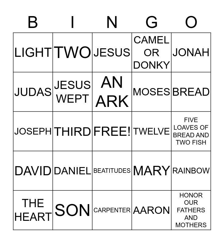 This bingo card has a free space and 24 words: DANIEL, SON, AN ARK, THE HEART, JONAH, LIGHT, JUDAS, TWO, TWELVE, BEATITUDES, MOSES, JOSEPH, MARY, RAINBOW, JESUS WEPT, AARON, FIVE LOAVES OF BREAD AND TWO FISH, JESUS, BREAD, THIRD, HONOR OUR FATHERS AND MOTHERS, DAVID, CAMEL OR DONKY and CARPENTER.