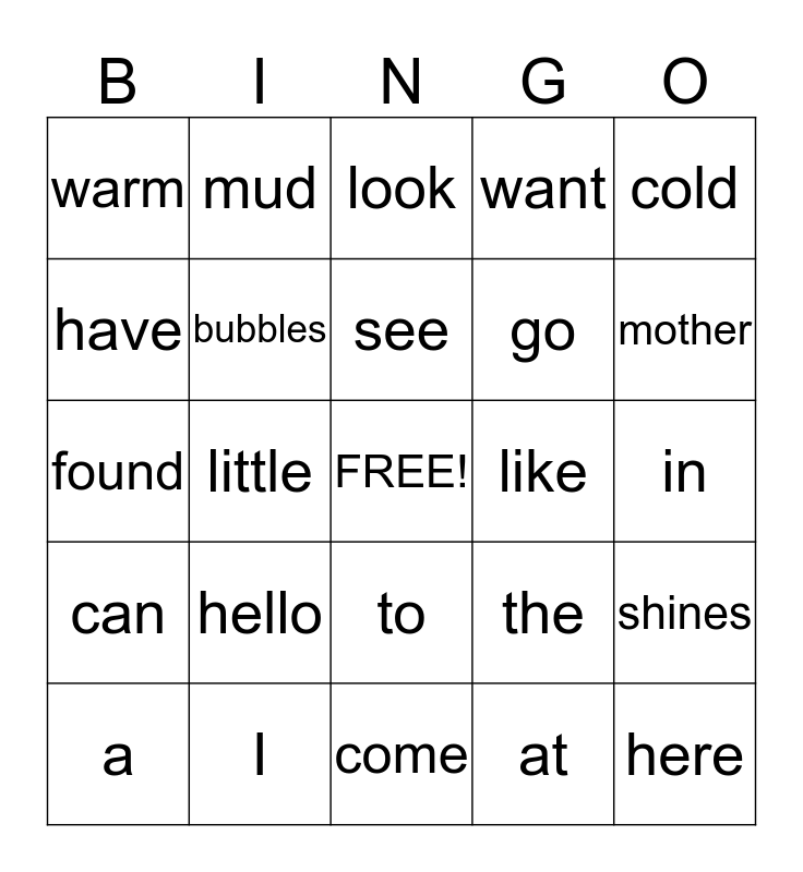 This bingo card has a free space and 24 words: hello, I, see, a, cold, warm, have, mud, like, to, go, found, the, shines, bubbles, at, in, look, mother, little, here, can, want and come.
