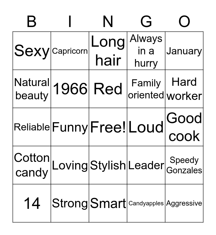 This bingo card has a free space and 34 words: jamaica, Candyapples, Highheel shoes, Popcorn, Cotton candy, 1966, January, 14, Capricorn, Bible, Red, Long hair, Tall, Beautiful, Loud, Hard worker, Strong, Reliable, Loving, Leader, Stylish, Fun, Sexy, Good cook, Smart, Aggressive, Always in a hurry, Giving, Family oriented, Natural beauty, Kind hearted, Funny, Speedy Gonzales and Spiritual.