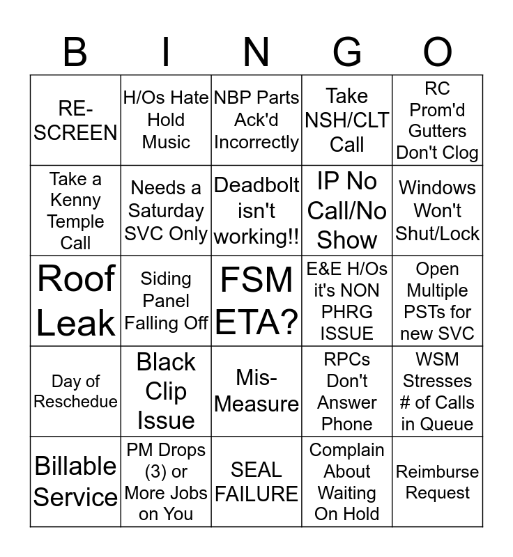 This bingo card has 25 words: Day of Reschedue, PM Drops (3) or More Jobs on You, FSM ETA?, Complain About Waiting On Hold, RC Prom'd Gutters Don't Clog, RE-SCREEN, H/Os Hate Hold Music, NBP Parts Ack'd Incorrectly, E&E H/Os it's NON PHRG ISSUE, WSM Stresses # of Calls in Queue, Take a Kenny Temple Call, Needs a Saturday SVC Only, SEAL FAILURE, RPCs Don't Answer Phone, Windows Won't Shut/Lock, Billable Service, Siding Panel Falling Off, Deadbolt isn't working!!, IP No Call/No Show, Open Multiple PSTs for new SVC, Roof Leak, Black Clip Issue, Mis-Measure, Take NSH/CLT Call and Reimburse Request.
