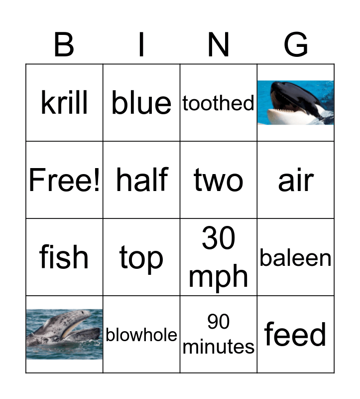 This bingo card has 2 images and 14 words: blowhole, baleen, toothed, krill, fish, blue, 30 mph, 90 minutes, Free!, half, top, air, two and feed.
