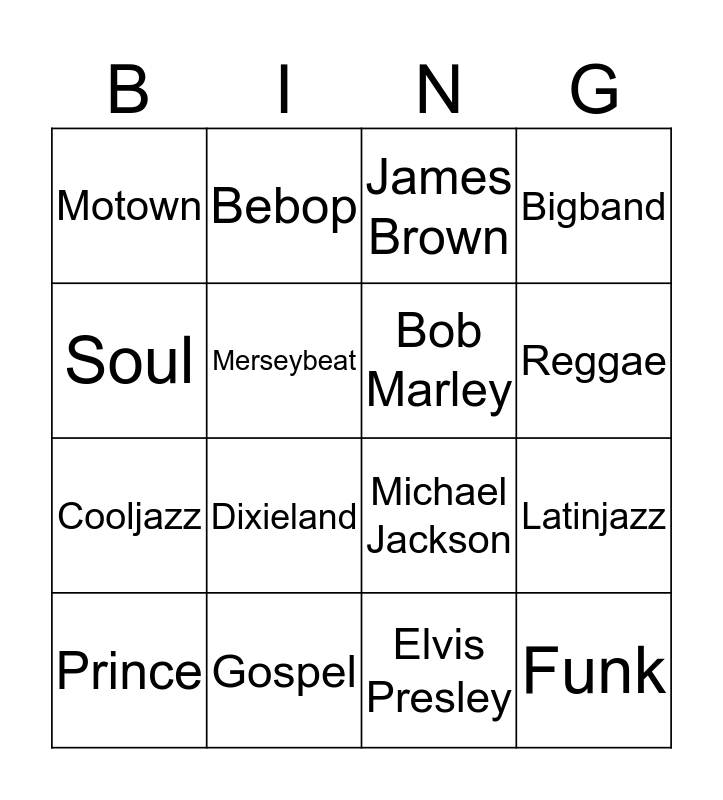 This bingo card has 23 words: Funk, Disco, Reggae, Hiphop, Soul, Motown, Merseybeat, Bebop, Prince, Blues, Dixieland, Cooljazz, Freejazz, Country, Gospel, Rock 'n Roll, James Brown, Michael Jackson, Bob Marley, Latinjazz, Bigband, Elvis Presley and Prince.