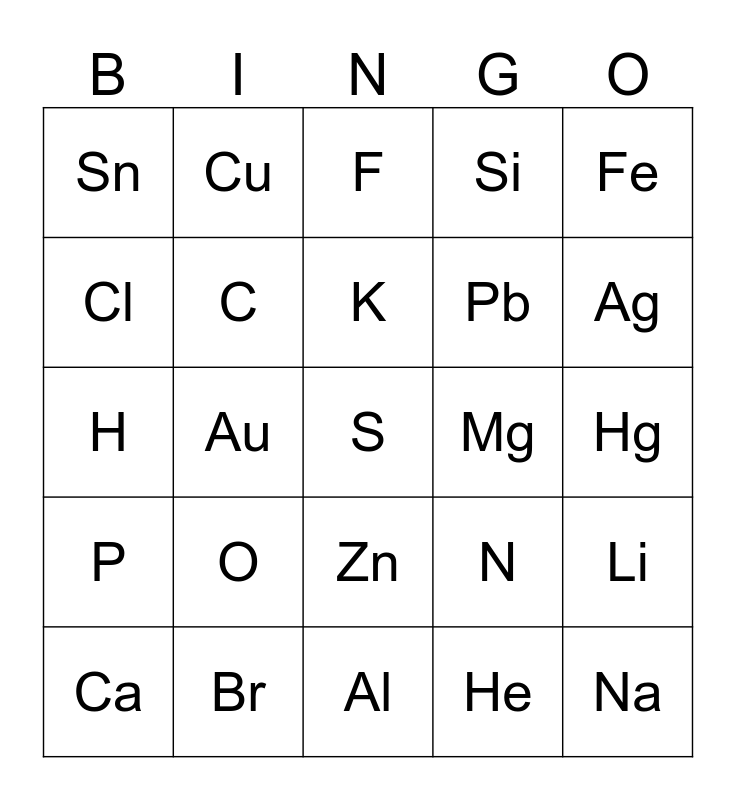 This bingo card has 25 words: O, Al, K, Ca, Fe, Sn, Cl, Cu, Mg, Zn, Pb, H, N, Li, C, Na, Hg, F, Ag, Au, S, Br, P, Si and He.