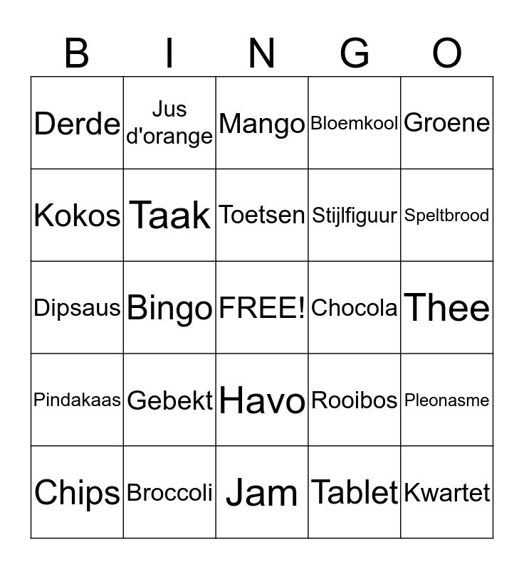 This bingo card has a free space and 28 words: Pleonasme, Tautologie, Stijlfiguur, Tablet, Kokos, Mango, Jus d'orange, Pindakaas, Chocola, Chips, Dipsaus, Bloemkool, Broccoli, Jam, Speltbrood, Goed, Gebekt, Taak, Toetsen, Havo, Derde, Twaalfde, Kwartet, Bingo, Thee, Rooibos, Groene and Muntthee.