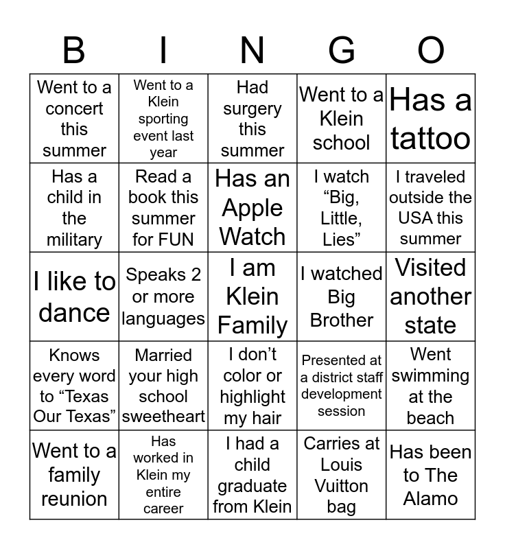 This bingo card has a free space and 24 words: Married your high school sweetheart, Has worked in Klein my entire career, Has an Apple Watch, Went to a family reunion, Has a tattoo, Went to a concert this summer, Has a child in the military, Went to a Klein sporting event last year, I watched Big Brother, I don’t color or highlight my hair, I watch “Big, Little, Lies”, I like to dance, Presented at a district staff development session, Went swimming at the beach, Read a book this summer for FUN, Carries at Louis Vuitton bag, Visited another state, Had surgery this summer, I traveled outside the USA this summer, Speaks 2 or more languages, Has been to The Alamo, Knows every word to “Texas Our Texas”, Went to a Klein school and I had a child graduate from Klein.