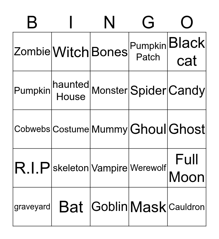 This bingo card has a free space and 24 words: skeleton, Bat, Monster, graveyard, Black cat, Zombie, Pumpkin, Witch, Ghoul, Vampire, Spider, Cobwebs, Werewolf, Full Moon, haunted House, Mask, Ghost, Bones, Candy, Costume, Cauldron, R.I.P, Pumpkin Patch and Goblin.