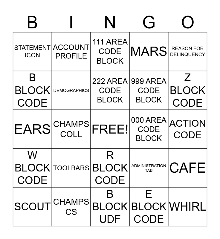This bingo card has a free space and 24 words: TOOLBARS, CHAMPS CS, 222 AREA CODE BLOCK, SCOUT, REASON FOR DELINQUENCY, STATEMENT ICON, B BLOCK CODE, ACCOUNT PROFILE, 000 AREA CODE BLOCK, R BLOCK CODE, 999 AREA CODE BLOCK, EARS, ADMINISTRATION TAB, CAFE, DEMOGRAPHICS, E BLOCK CODE, ACTION CODE, 111 AREA CODE BLOCK, Z BLOCK CODE, CHAMPS COLL, WHIRL, W BLOCK CODE, MARS and B BLOCK UDF.