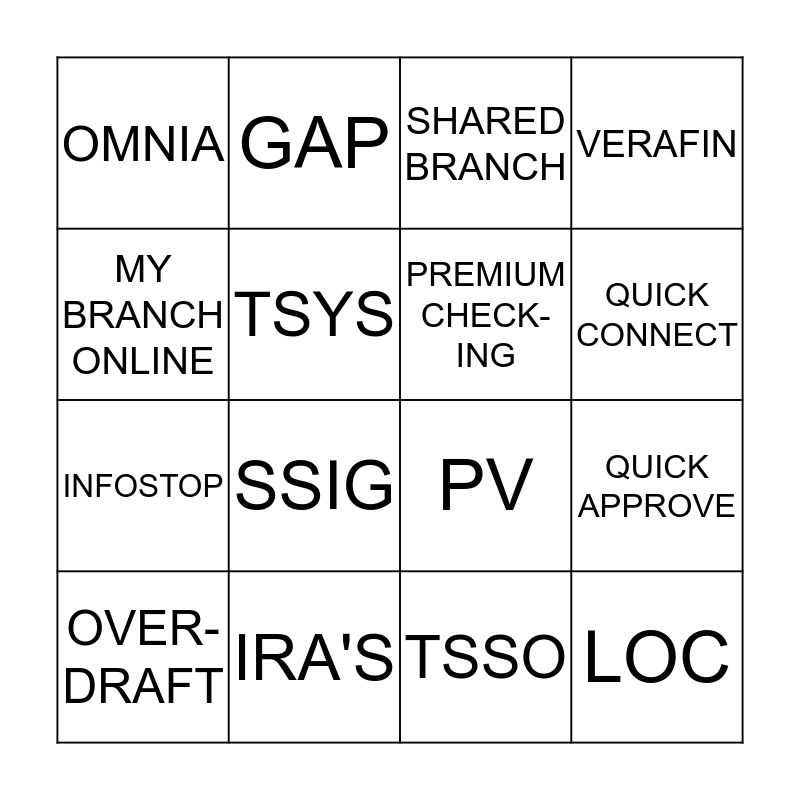 This bingo card has 16 words: IRA'S, QUICK APPROVE, SHARED BRANCH, OMNIA, INFOSTOP, GAP, PV, TSSO, MY BRANCH ONLINE, TSYS, OVER-DRAFT, VERAFIN, SSIG, QUICK CONNECT, PREMIUM CHECK-ING and LOC.