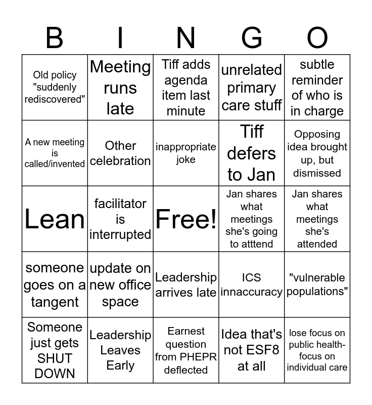 This bingo card has a free space and 40 words: A3, Lean, Birthday, Other celebration, Leadership Leaves Early, Leadership arrives late, inappropriate joke, unsubtle reminder of who is in charge, subtle reminder of who is in charge, someone goes on a tangent, facilitator is interrupted, unrelated primary care stuff, lose focus on public health- focus on individual care, Jan shares what meetings she's attended, Jan shares what meetings she's going to atttend, update on new office space, "New" policy, Old policy "suddenly rediscovered", Jan adds agenda item last minute, Tiff adds agenda item last minute, "vulnerable populations", Idea that's not ESF8 at all, Tiff defers to Jan, A new meeting is called/invented, a new workgroup is suggested, Lip service given to self care, vague idea with no purpose brought up as possible next thing, Blame game - PHEPR, Blame game - DPH, Blame game - CCSF, humblebrag, Someone just gets SHUT DOWN, Disagreeing with someones opinion, ICS innaccuracy, Opposing idea brought up, but dismissed, Earnest question from PHEPR deflected, Inappropriate discussion, attempt to blur social/professional lines, Meeting runs late and Agenda item doesn't have answer yet, postpone a week..