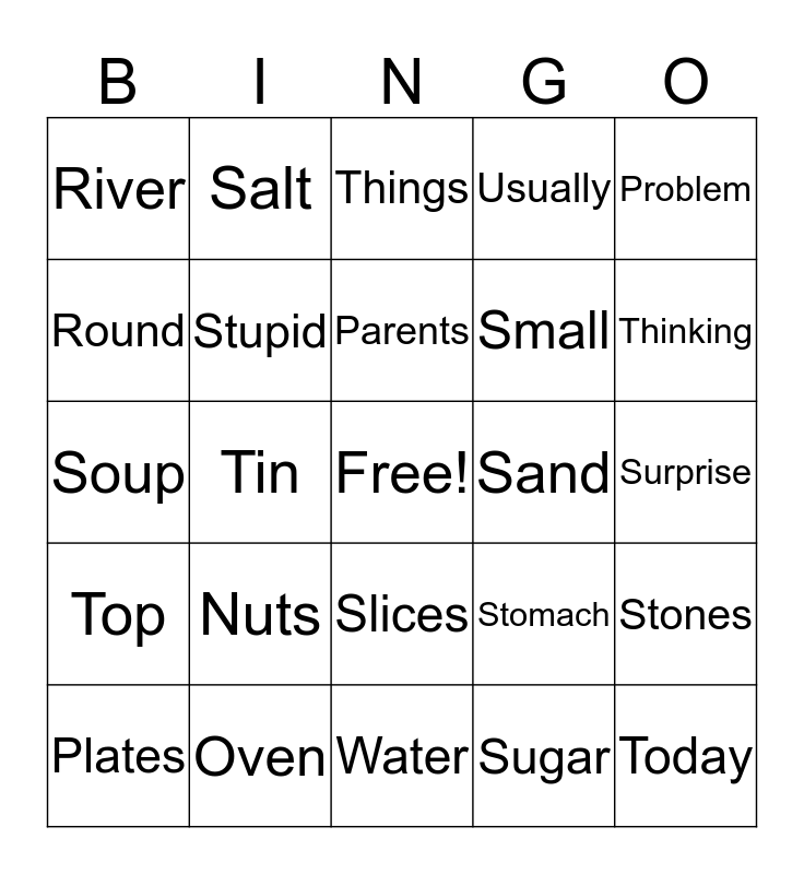 This bingo card has a free space and 24 words: Nuts, Oven, Parents, Plates, Problem, River, Round, Salt, Sand, Slices, Small, Soup, Stomach, Stones, Stupid, Sugar, Surprise, Things, Thinking, Tin, Today, Top, Usually and Water.