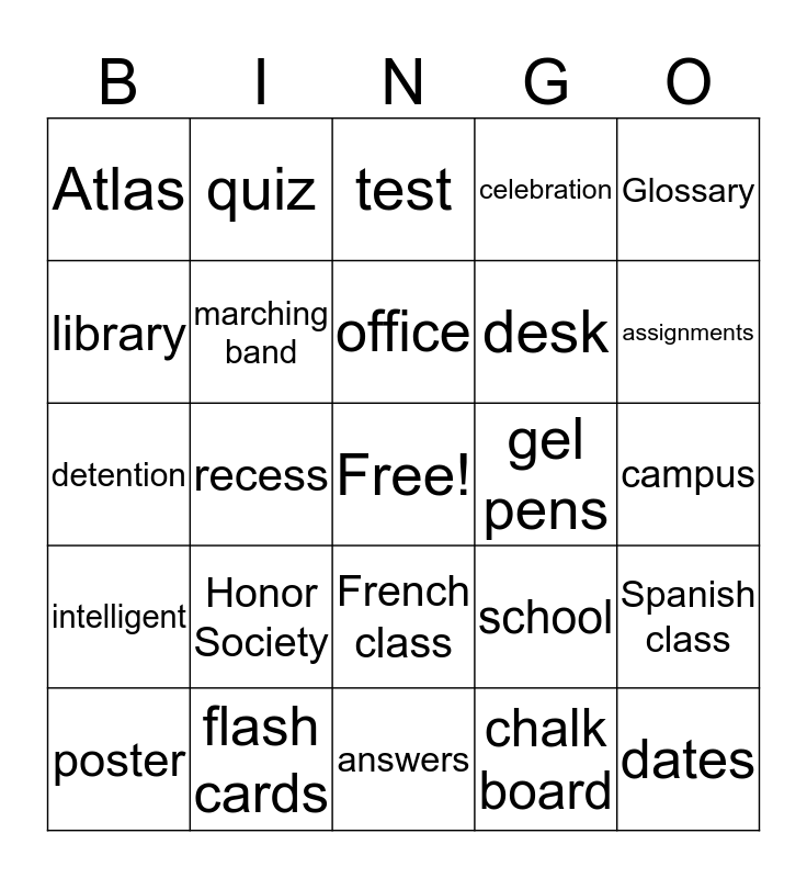 This bingo card has a free space and 148 words: Girlfriend, stapler, student, grades, midterms, school, class clown, homecoming, varsity, friends, goals, assistant principle, study Hall, chairs, loose leaf paper, dictionary, eraser, laptop, lunch box, binder, English, Spanish class, memo pad, notebook, think, recess, quiz, staples, rubber bands, ruler, books, major, knowledge, campus, education, prom, cheerleading, principle, desk, ink, lesson, encyclopedia, French class, highlighter, speech, map, hole puncher, printer, the saurus, blackboard, physical education, paste, poster, pupil, advice, success, jobs, science, basketball, teacher, test, backpack, chalk board, folders, calendars, gel pens, intelligent, keyboard, markers, construction paper, compass, scores, Atlas, arithmetic, boyfriend, writing, sharpener, achievement, graduation day, celebration, memories, gymnasium, history, football, counselor, lunch, calculator, pens, chalk, answers, dividers, bookmark, classroom, experiment, flash cards, glue, SAT, homeroom, reading, smart, Projector, tape, library, commencement, dedication, congratulations, mechanical pencils, lockers, vocabulary, exam, globe, college, color pencil, marching band, Honor Society, pencils, assignments, cap and gown, dates, Glossary, crayons, detention, tardy, absent, office, attendance, summer vacation, spring break, picture day, referrals, school board, mascots, class president, valid Victorian, secretary, school board, King, queen, class schedules, pep rally, assembly, bleachers, baseball, teens, team, games, cafeteria and summer school.