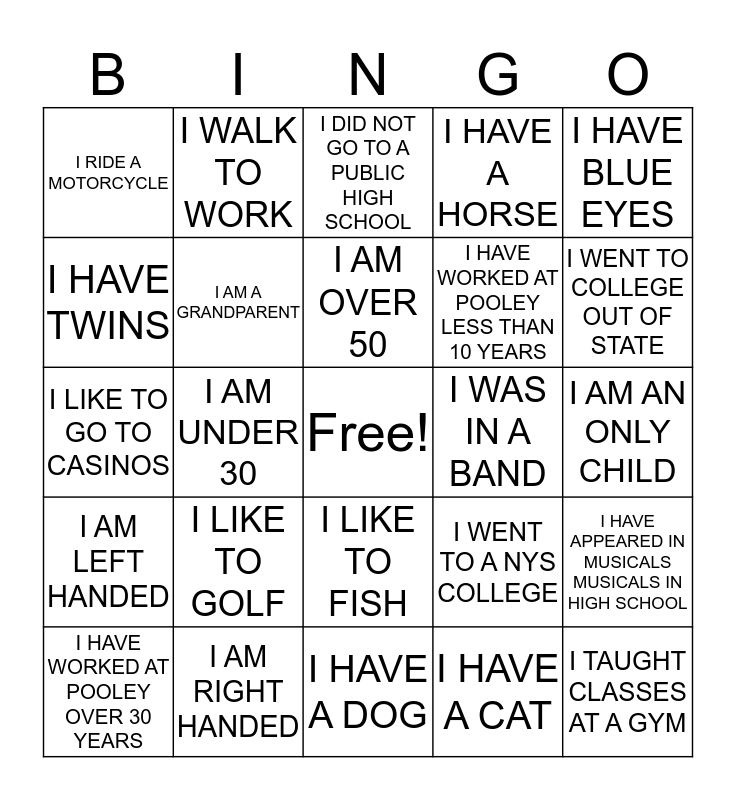 This bingo card has a free space and 25 words: I AM LEFT HANDED, I AM RIGHT HANDED, I HAVE A DOG, I HAVE A CAT, I HAVE BLUE EYES, I RIDE A MOTORCYCLE, I WALK TO WORK, I DID NOT GO TO A PUBLIC HIGH SCHOOL, I WAS IN A BAND, I HAVE APPEARED IN MUSICALS MUSICALS IN HIGH SCHOOL, I HAVE TWINS, I AM A GRANDPARENT, I RESTORE CARS, I WENT TO A NYS COLLEGE, I WENT TO COLLEGE OUT OF STATE, I HAVE WORKED AT POOLEY OVER 30 YEARS, I AM UNDER 30, I AM OVER 50, I HAVE WORKED AT POOLEY LESS THAN 10 YEARS, I AM AN ONLY CHILD, I LIKE TO GO TO CASINOS, I LIKE TO GOLF, I LIKE TO FISH, I HAVE A HORSE and I TAUGHT CLASSES AT A GYM.