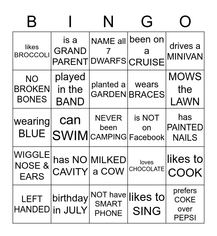 This bingo card has a free space and 29 words: LEFT HANDED, plays CHESS, can SWIM, has a PET, likes BROCCOLI, NAME all 7 DWARFS, played in the BAND, has NO CAVITY, is NOT on Facebook, birthday in JULY, has PAINTED NAILS, prefers COKE over PEPSI, NOT have SMART PHONE, likes to SING, MOWS the LAWN, WALKS to SCHOOL, MILKED a COW, WIGGLE NOSE & EARS, drives a MINIVAN, wearing BLUE, loves CHOCOLATE, EXERCISE 3X last week, wears BRACES, NO BROKEN BONES, been on a CRUISE, is a GRAND PARENT, likes to COOK, planted a GARDEN and LOVES to go to MOVIES.