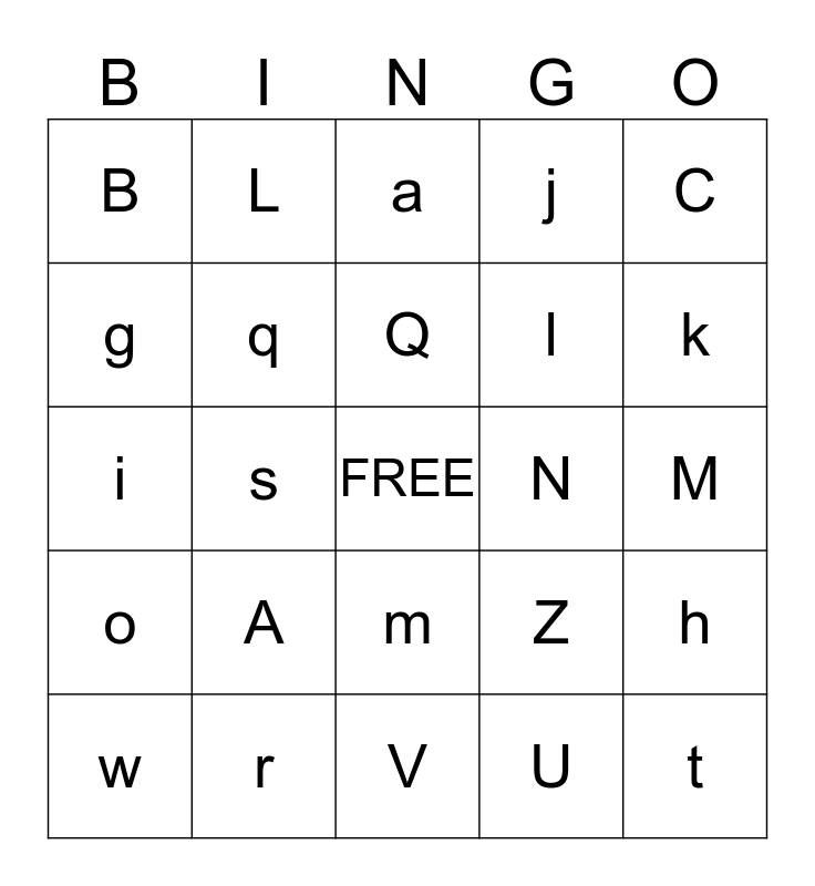This bingo card has a free space and 24 words: A, r, Q, w, C, B, g, L, N, m, l, i, Z, h, q, U, M, a, k, s, t, o, j and V.